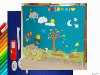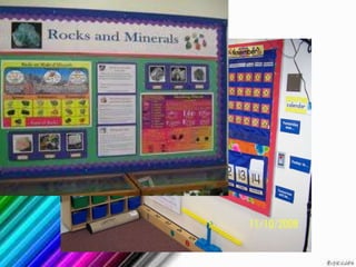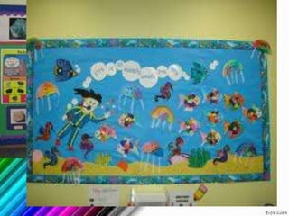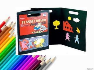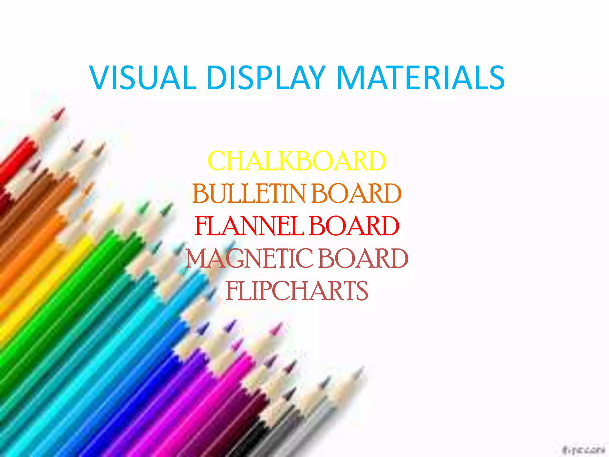 The document describes various visual display materials commonly used in classrooms including chalkboards, bulletin boards, flannel boards, magnetic boards, and flipcharts. It provides details on the purpose and usage of each material and discusses advantages such as being interactive and easy to construct while also noting disadvantages like cut-outs getting lost or small text being difficult to see from a distance. Guidelines are provided for effective application of these visual aids in lessons.