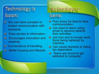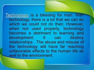 Educational technology is a complex field that aims to solve problems in human learning. It involves analyzing learning problems and developing solutions through the use of educational methods, resources, and technology. Technology can serve as both a teacher delivering instruction and a partner in the learning process when used in a constructivist way. When integrated effectively, educational technology can engage students, support different types of learning like collaboration and reflection, and make learning more meaningful.