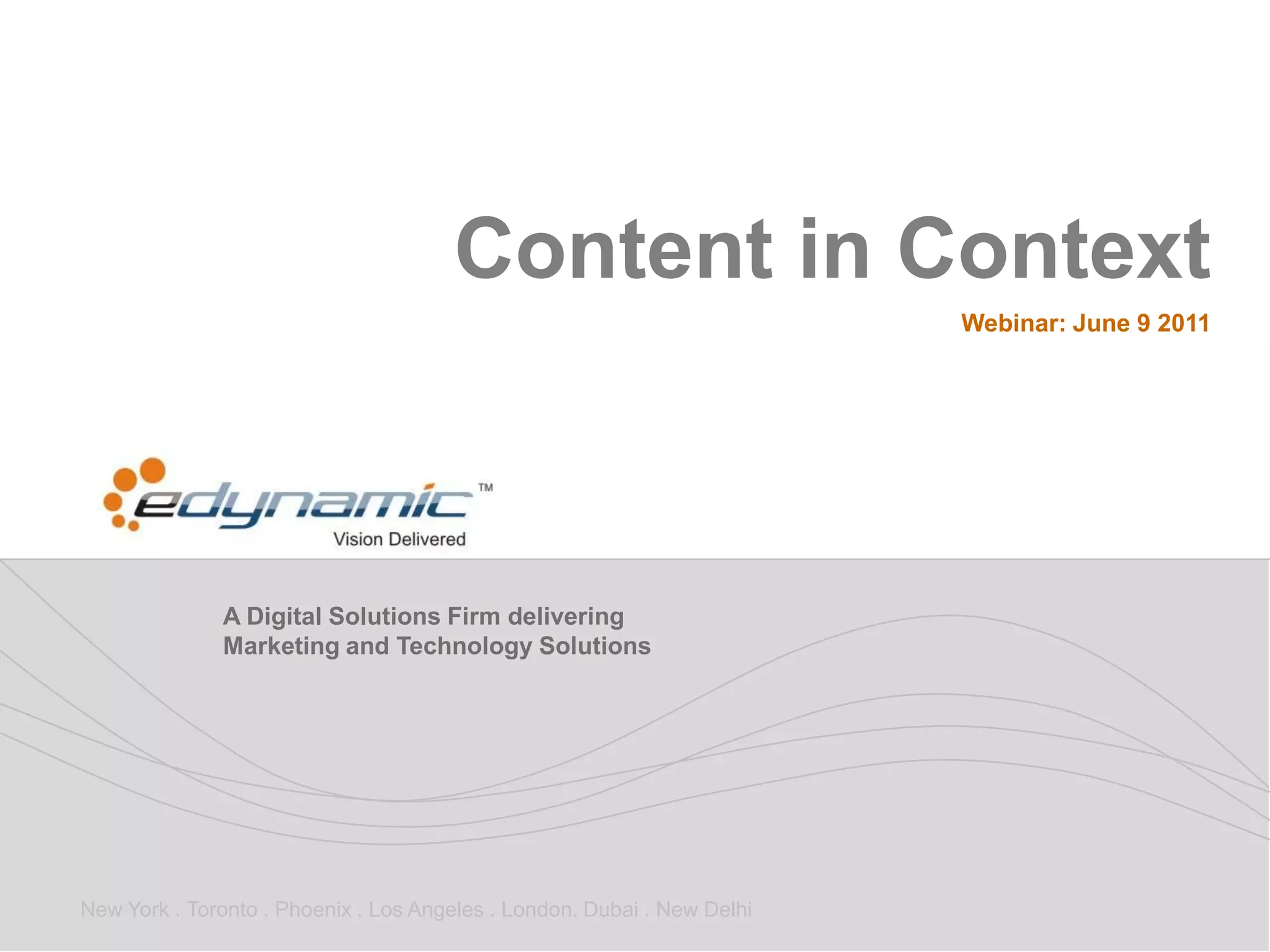 1. The webinar discussed challenges with traditional content marketing and introduced the concept of context-driven marketing, which aims to engage customers through relevant content tailored to their point in the buying cycle.