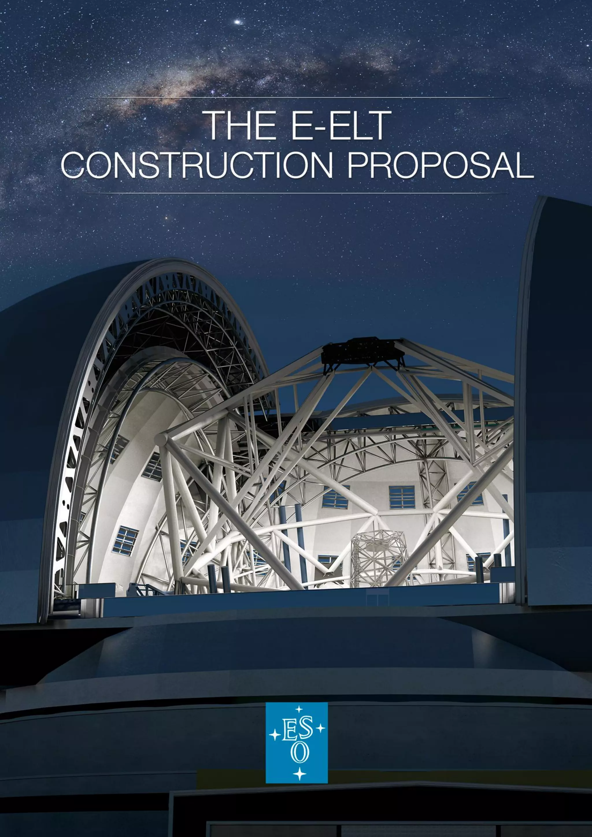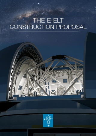 This document proposes constructing the European Extremely Large Telescope (E-ELT) over 11 years at a cost of 1,083 million euros. The E-ELT will be a 39.3-meter segmented optical telescope located on Cerro Armazones in Chile. It will have an adaptive optics system to correct for atmospheric disturbances. The proposal includes plans for instruments, infrastructure extensions, and an operations plan to ensure the telescope is utilized for cutting-edge science upon completion. The E-ELT aims to answer fundamental questions in astrophysics such as detecting Earth-like exoplanets, testing physics in extreme environments, understanding black holes and their role in galaxy formation, and illuminating star and galaxy evolution throughout cosmic history.
