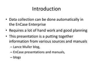 The document provides an overview of the basic steps for conducting an ediscovery collection using Guidance Software's EnCase Enterprise v7. It describes installing the required EnCase Enterprise components like the SAFE, Examiner and Servlets. It then outlines how to open a new case, define the target nodes, create a collection sweep to retrieve files and metadata based on conditions, and handle the sweep results. The summary provides the essential workflow and technical components involved in performing a foundational EnCase Enterprise collection.