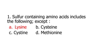 Sulfur-containing amino acids are important building blocks of proteins and enzymes in the body. They include cysteine, cystine, and methionine, but not lysine. These amino acids help maintain proper structure and function of many proteins and play key roles in metabolism.