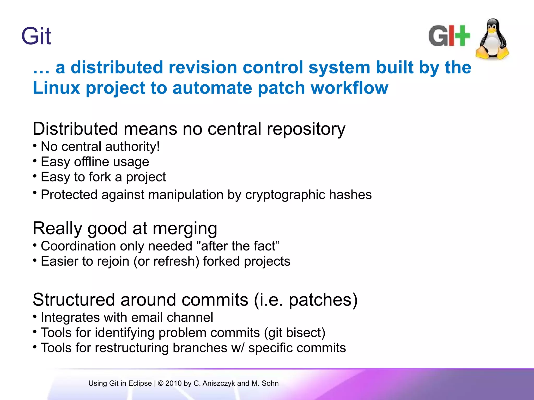 EGit is an Eclipse plugin that allows developers to use the distributed revision control system Git within Eclipse. It is built on top of JGit, a lightweight Java library implementation of Git. The goal is for EGit and JGit to improve Git tooling for the Eclipse community. Gerrit is also introduced as a code review system that integrates with Git and provides access control and workflows for code reviews.