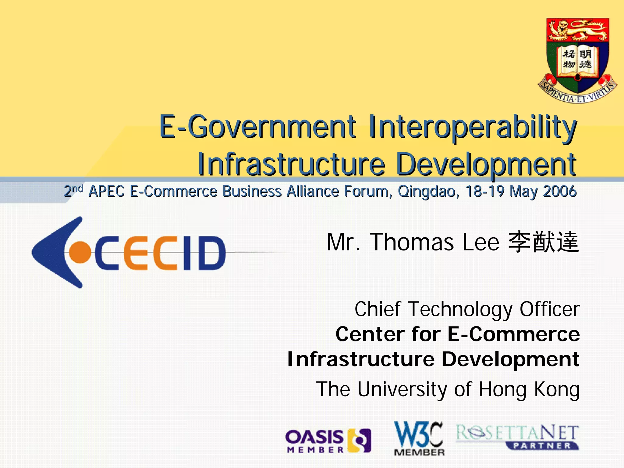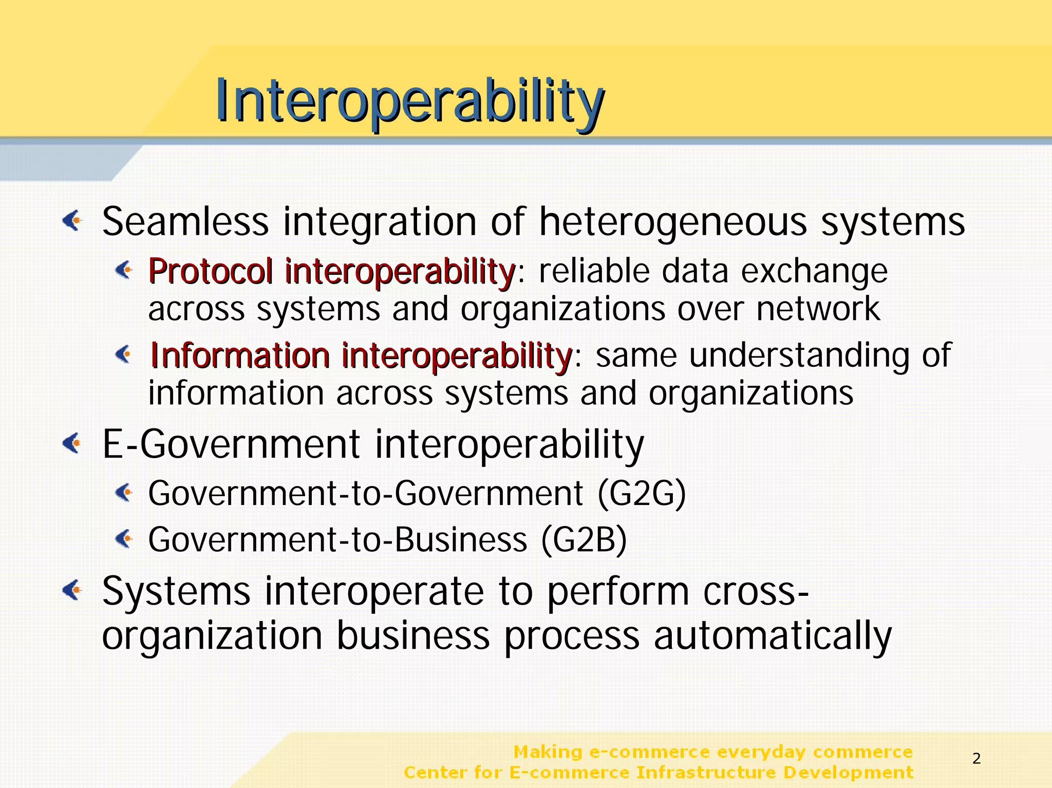The document discusses the development of e-government interoperability infrastructure as presented at the APEC e-commerce business alliance forum in 2006, highlighting the importance of seamless integration and reliable data exchange among government and business systems. It also outlines the initiatives, technical specifications, and methodologies designed to promote service integration and accessibility through XML and open standards. Key elements include the establishment of a central data registry, recommendations for XML schema design, and the adoption of e-government technologies to facilitate business processes and enhance international competitiveness.