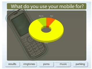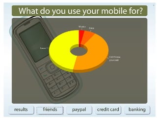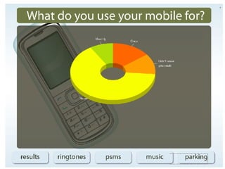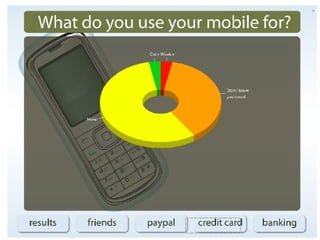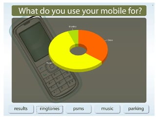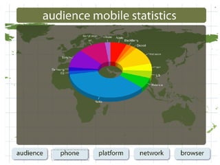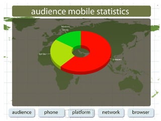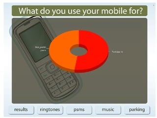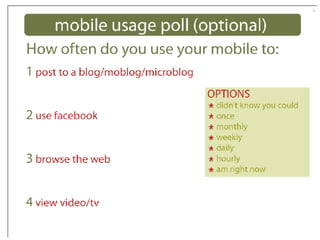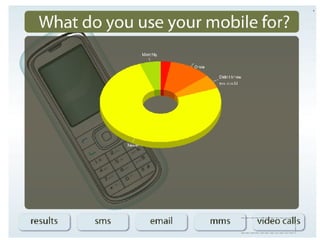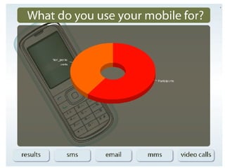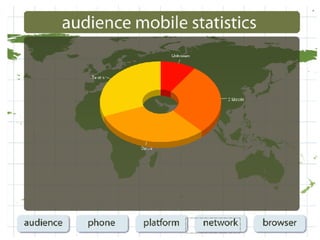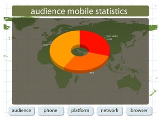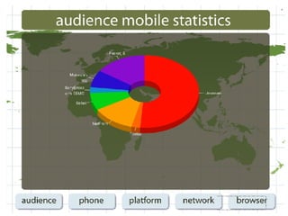 This presentation at Web Directions South 2007 captures the screens from an interactive poll held during the presentation. 67 people in the audience joined in and a dynamic profile of their phones, browsers, operating system and network providers is also include. A more involved analysis of the results will be available soon...
