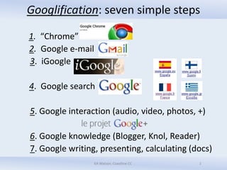 This document outlines a 7 step process for "Googlification" to enhance education. The steps are: 1) Install Google Chrome, 2) Use Google communication tools like Gmail, 3) Customize your iGoogle homepage, 4) Use Google search, 5) Interact through Google audio, video, photos and Google+, 6) Get knowledge through Blogger, Knol and Google Reader, 7) Write, present and calculate using Google Docs. The document provides details on how to access and use each Google tool and why its use enhances areas like speed, organization and interaction.
