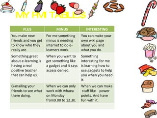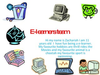 Zachariah is an 11-year-old e-learner who enjoys thrill rides, movies, and swimming. He notes some positives of e-learning include making new friends and having helpful teachers. However, he mentions a downside is needing internet access to complete schoolwork. Zachariah hopes to learn how to use gadgets, get into the e-learning class again next year because he enjoys it, and make his own wiki page.
