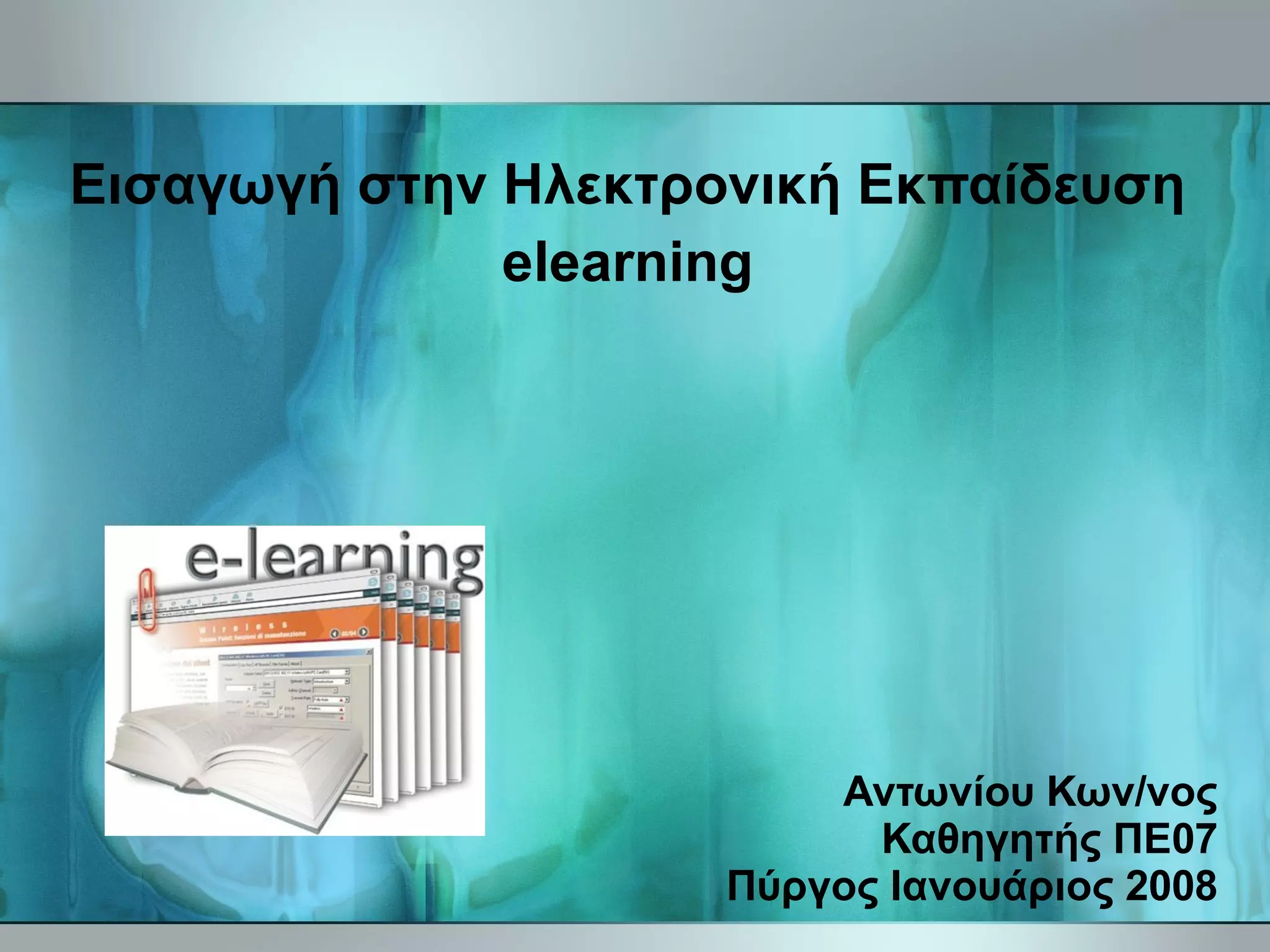Συχνοί όροι Blendedlearning CALL (computer-assisted language learning) (for a more historical perspective) Collaborative learning Computeach Computer Based Teaching Computer Based Testing Computer-based training Confidence-Based Learning Distance education Educational technology Electronic performance support system eLearning 2.0 Flexible Learning Mobile-learning Microlearning Networked learning Online tutoring Online learning community Virtual Campus Virtual education Virtual learning environment Web-based training Adaptive hypermedia