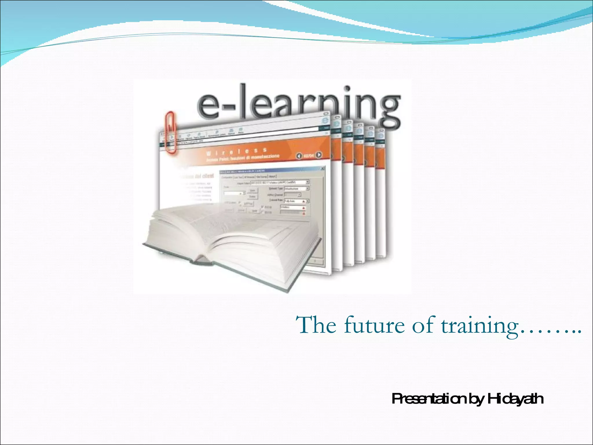 E-learning involves facilitating training through electronic means like computers and the Internet. It offers many benefits like being cost-effective, allowing global access, and providing up-to-date information easily. E-learning can be synchronous, asynchronous, or embedded and includes online courses, discussions, and virtual classrooms. Learners enroll in e-learning modules and complete assessments to move through the modules, which require minimal computer skills. E-learning has lower costs than other training methods since learners can access it anywhere with an Internet connection using different devices. Calculating the return on investment of e-learning involves gathering data on costs of design, delivery, administration, and potential reductions from e-learning.