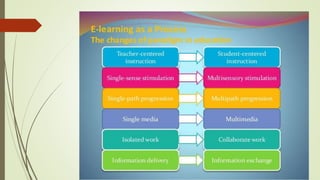 E-learning refers to electronic learning systems that provide teaching through electronic resources and the internet. There are 10 types of e-learning including computer-managed learning, computer-assisted instruction, synchronous online learning, and asynchronous online learning. E-learning aims to increase student engagement with materials and independent learning skills. It can be implemented through websites, links, chats, quizzes and databases. While e-learning provides benefits like flexibility, cost savings and personalized learning, it also faces challenges such as lack of face-to-face interaction, technical issues, and security/authentication concerns.