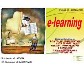 Dokumen tersebut membahas tentang perubahan paradigma dalam pendidikan dengan adanya pengaruh IT, termasuk konsep e-learning. E-learning merupakan cara pengajaran dan pembelajaran menggunakan media elektronik untuk menyampaikan materi pembelajaran dan interaksi antara siswa dan pengajar. E-learning memiliki beberapa keuntungan seperti menghemat waktu dan biaya, serta dapat menjangkau wilayah yang lebih luas, namun juga memiliki tant