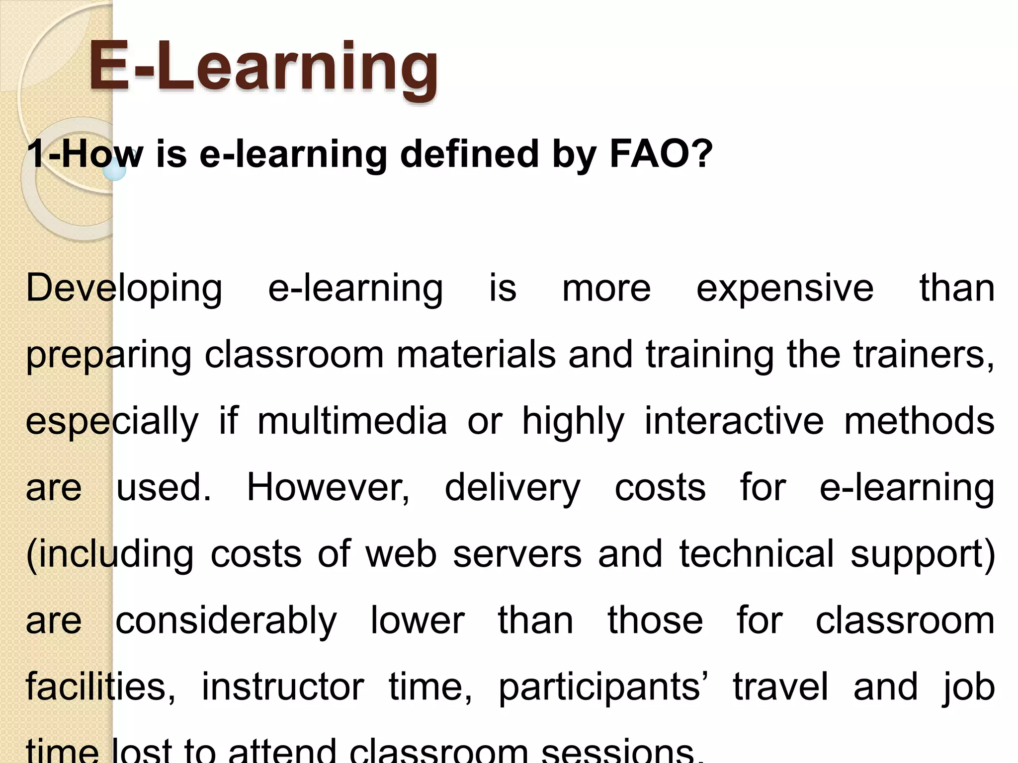 The document discusses e-learning as defined by FAO, emphasizing that while initial development costs may be higher, delivery costs are generally lower than traditional classroom settings. It identifies ideal situations for e-learning, such as when learners are geographically dispersed, have limited mobility, or prefer self-paced learning, and highlights the benefits of e-learning, including personalized learning paths and consistency in instruction. Additionally, it outlines important considerations for choosing between e-learning and face-to-face instruction, and lists five key characteristics of effective e-learning: learner-centered content, granularity, engaging content, interactivity, and personalization.