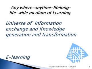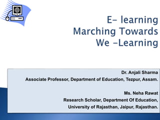 The document discusses the evolution of e-learning from its early origins using technology to enhance classroom learning to modern implementations using internet-based learning. Key developments included the establishment of computer-based lectures in the 1960s, the creation of the internet and wireless communication technologies in the 1960s-1970s, and the rise of distance education in the 1980s utilizing these advancements. More recent evolutions discussed include mobile learning using portable devices, social and collaborative approaches termed "we-learning", and the emergence of massive open online courses. The document argues e-learning must now be defined as endless, essential, and emotional to reflect its collaborative and personalized nature.