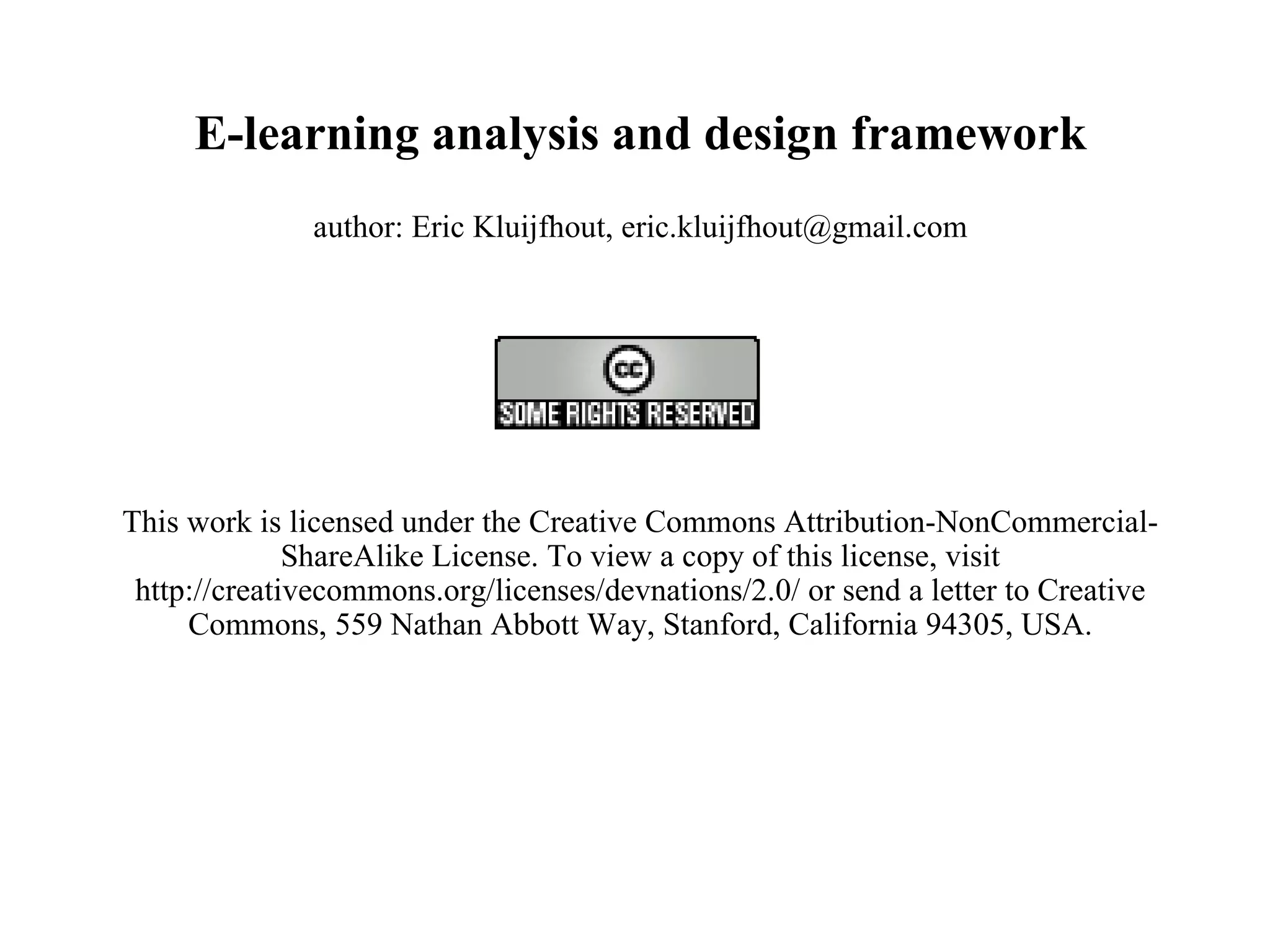 The document outlines an e-learning analysis and design framework developed by Eric Kluijfhout for the Institute for Community Participation at Bethlehem University. It details three dimensions of e-learning—pedagogical, technological, and organizational—across macro (national), mezzo (institutional), and micro (learning) levels. Additionally, it identifies various prerequisites and influences that impact e-learning effectiveness, including curriculum, technology access, and institutional strategies.