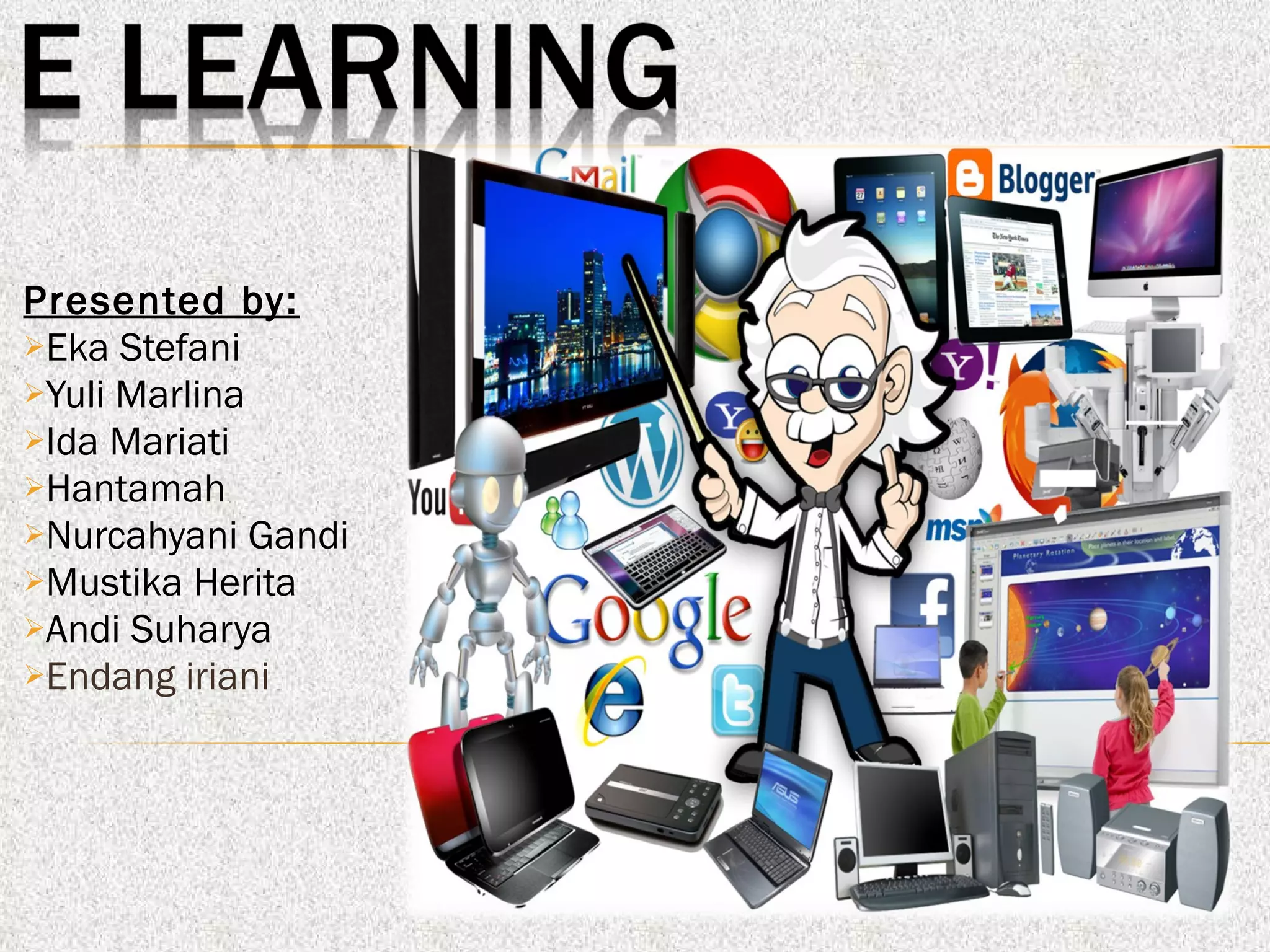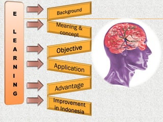 E-Learning comprises all forms of electronically supported learning and teaching. It serves as a specific media to implement the learning process through networked or non-networked learning. Some benefits of E-Learning include convenience and flexibility, more effective learning experiences, and more efficient learning without compromising quality. However, fully realizing the benefits of E-Learning in Indonesia requires addressing factors like infrastructure, telecommunications, resources, and familiarity.