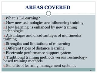 This document discusses e-learning and how new technologies are influencing training. It covers topics like different types of e-learning, distance learning, simulations, and learning management systems. The key benefits of technology in training are that it allows employees to learn anywhere and anytime, reduces costs, and increases the effectiveness of the learning environment. However, factors like high development costs and lack of technical skills can limit the use of e-learning. Overall, the document examines how new technologies are enhancing learning and training delivery methods.