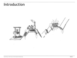 The document discusses how technology and digital transformation are disrupting enterprises and requiring new approaches to learning. It explores how technology is changing rapidly, forcing enterprises to adapt on an "instant" basis. It also examines how individuals are adapting more quickly than organizations. The document argues that learning must change to help organizations become "instant enterprises" that can leverage invisible and pervasive digital tools to respond in real time to unanticipated changes. The focus is on how learning can help amplify individuals and transform enterprises to thrive in this new digital environment defined by constant and immediate change.