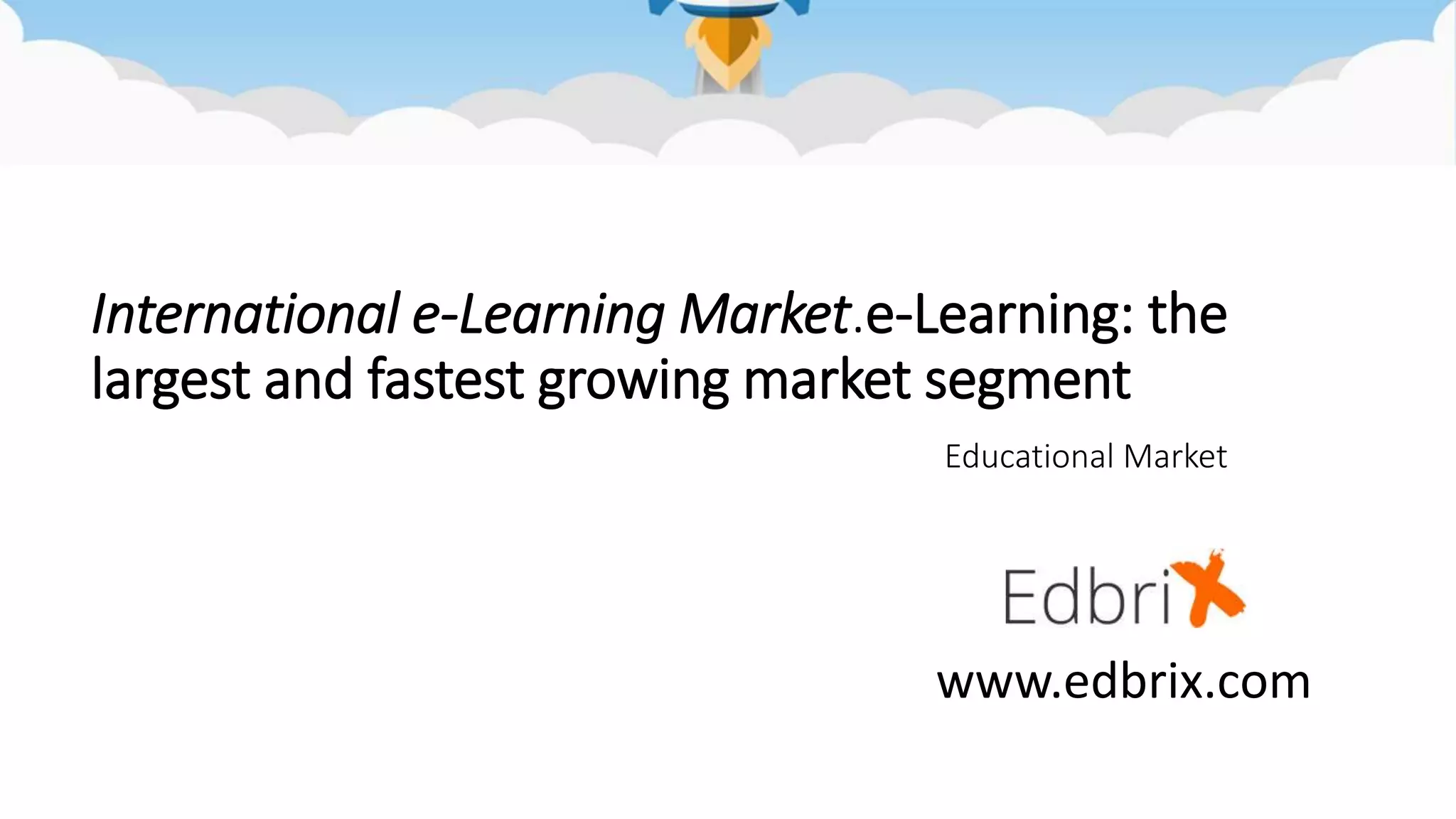 The e-learning market is growing rapidly and is projected to reach $200 billion by 2019. E-learning currently accounts for about half of all college courses and is growing faster than traditional education. The largest e-learning markets are currently the United States and Europe, but Asia Pacific is growing quickly, led by Malaysia and Vietnam. Factors like MOOCs, mobile learning, and gamification are driving further growth in the e-learning industry. The document proposes the Edbrix platform as a solution to improve collaboration in e-learning and address issues like a lack of notifications, progress tracking, and security.
