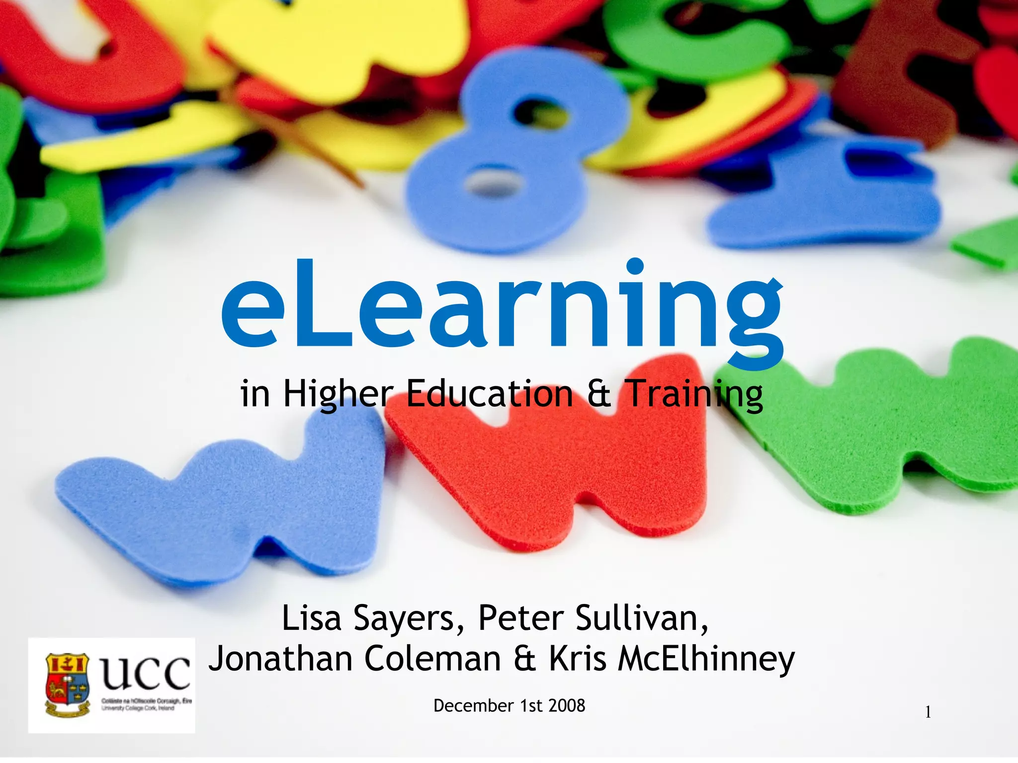 The document discusses eLearning in higher education and training. It provides examples of different forms of eLearning like learning management systems, Moodle, browser-based training, Open University, and distance learning. It also discusses the positives of eLearning in increasing access and student engagement, and the challenges of eLearning like student and instructor skills, technical issues, and managing student motivation in distance learning.