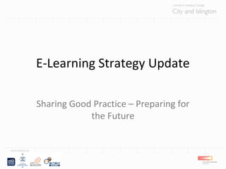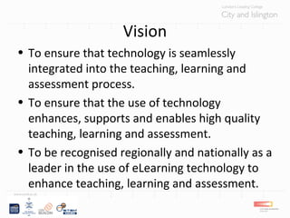 The document outlines an e-learning strategy and vision for a college. It discusses developing a strong e-learning team, mandatory online modules, and providing access to online resources. The vision is to seamlessly integrate technology into teaching and learning to enhance quality. It also stresses the need for engagement from teaching staff and supporting the development of students' and teachers' ICT skills. Finally, it discusses potential future directions for e-learning such as social networking, mobile devices, augmented reality, and MOOCs.