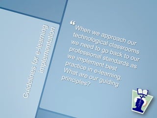 This document provides guidelines for effective e-learning implementation from the perspective of several educational standards and policy briefs. It discusses that teachers should: