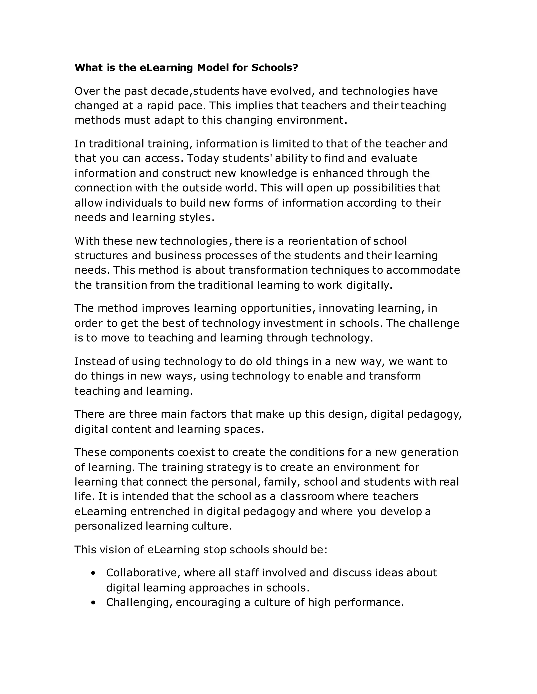 The document discusses an eLearning model for schools that aims to transform traditional teaching and learning using digital technologies. The model has three main components: digital pedagogy, digital content, and learning spaces. Digital pedagogy involves using technology to improve instruction, engage students, and develop digital literacy skills. Digital content consists of online resources and a digitally-designed curriculum. Learning spaces encompass both physical and virtual spaces where students can learn. The goal of the eLearning model is to create a student-centered environment that develops skills like collaboration, communication, and critical thinking through technology-enabled teaching methods.