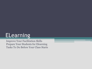 This document discusses preparing students and instructors for elearning. It emphasizes that students may struggle with the exploratory nature of online learning compared to traditional classrooms where instructors directly provide answers. To help students, instructors should provide support like introductions, schedules, links to resources and scheduled chat times. Students also need basic computer/internet skills and self-direction. Instructors should familiarize themselves with online tools, take courses as students, and test course elements before teaching. Preparing both students and instructors is key to avoiding high dropout rates in online learning.