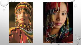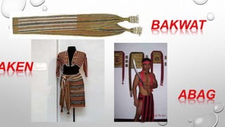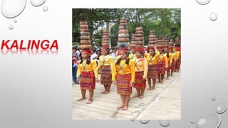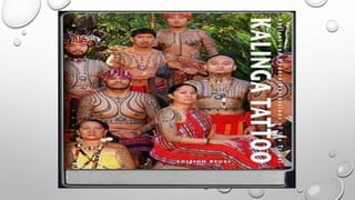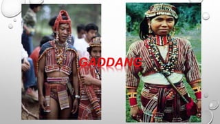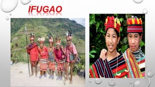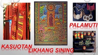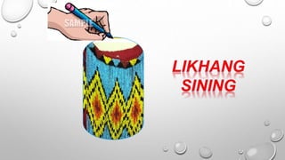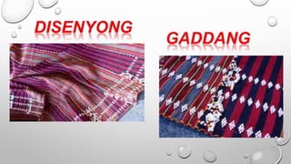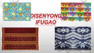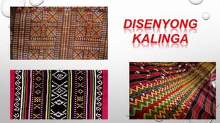 Ang dokumento ay tungkol sa mga kultural na disenyo ng mga pamayanan sa Luzon, tulad ng mga Ifugao, Kalinga, at Gaddang, na may mga likhang sining na hango sa kalikasan. Ipinapakita nito ang mga elemento ng sining tulad ng linya, kulay, at hugis na ginagamitan sa kanilang mga tradisyunal na kasuotan at palamuti. Ang mga mag-aaral ay hinihikayat na lumikha ng sariling likhang sining batay sa mga disenyo ng kanilang kultural na pamayanan.