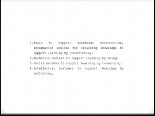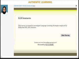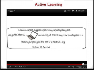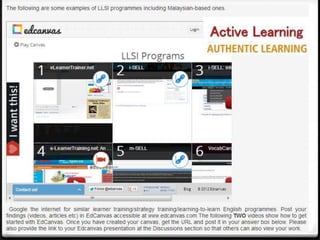 This document discusses why some e-learning programs fail and provides examples of meaningful e-learning through active, authentic, collaborative, and constructive learning. It concludes that e-learning should create meaningful learning by engaging learners in tasks and activities using technology, rather than just delivering content, and should consider integrating personal learning environments and social media familiar to learners.