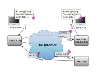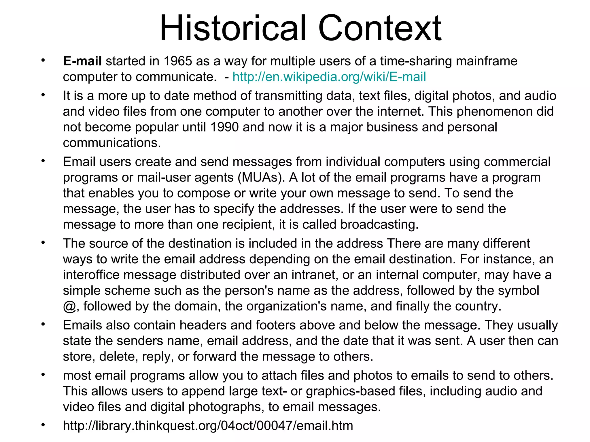 E-mail began in 1965 as a way for users of time-sharing computers to communicate. It became popular in 1990 and is now a major form of personal and business communication. E-mail works on a 'store and forward' basis, with messages stored on servers until recipients access their accounts to retrieve messages sent to their username@domain address.