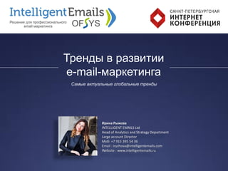 Документ представляет информацию о компании Intelligent Emails, которая специализируется на e-mail-маркетинге и успешно работает на российском рынке более 9 лет. В нем описаны актуальные тренды в этой области, такие как персонализация контента, использование видео и геолокационных данных, а также стратегии для оптимизации e-mail-кампаний. Автор подчеркивает важность автоматизации и персонализации для повышения ROI и успешного взаимодействия с клиентами.