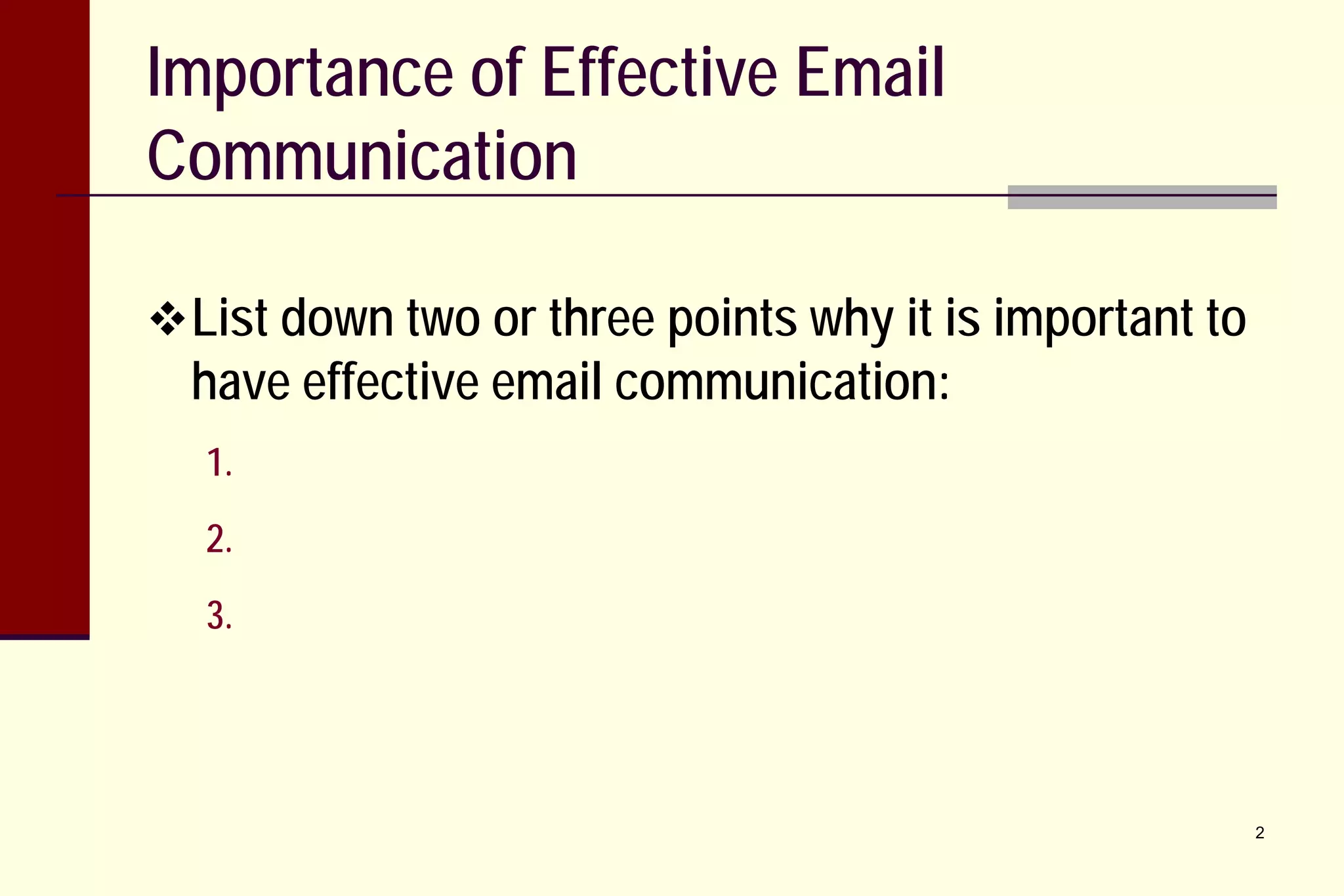 Effective email communication is important for professional relationships. When writing emails, it is essential to plan purpose and content, use an appropriate tone for the recipient, and include a clear subject line, greeting, main points, closure, and signature. Details should be concise and to the point. Proper grammar, spelling, and tone help ensure the message is understood as intended. Proofreading before sending helps avoid errors that could damage relationships or understanding.