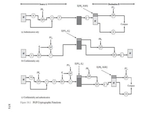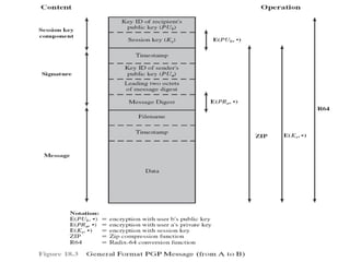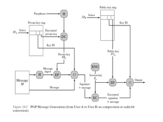 PGP (Pretty Good Privacy) is an open-source email security software that provides authentication through digital signatures, confidentiality through symmetric encryption of messages, compression using ZIP, and compatibility with email systems through base64 encoding. It uses public-key cryptography for encrypting symmetric session keys and signing messages. Keys are stored in private and public key rings along with metadata for easy management. Messages contain encrypted data, signature, and encrypted session key components.