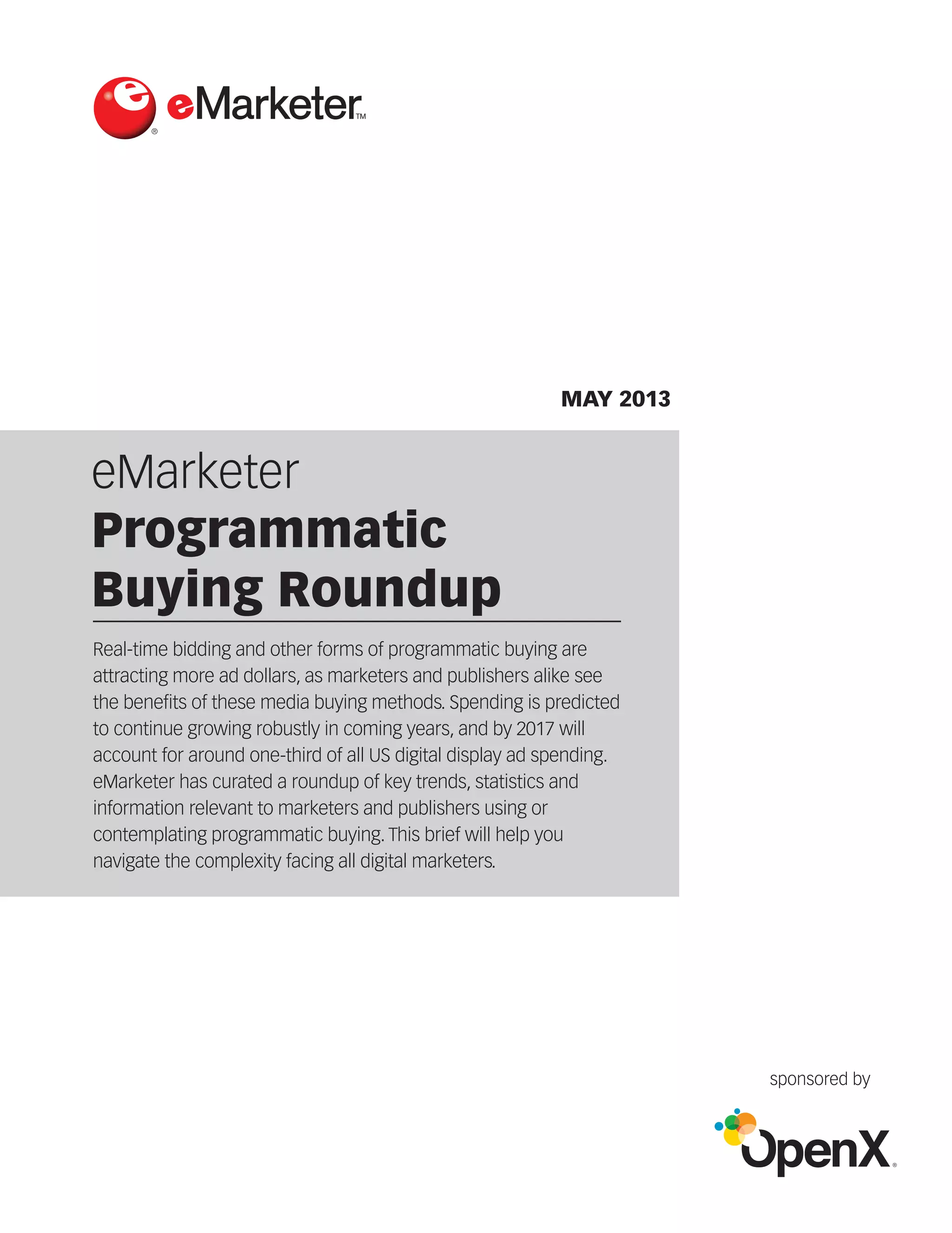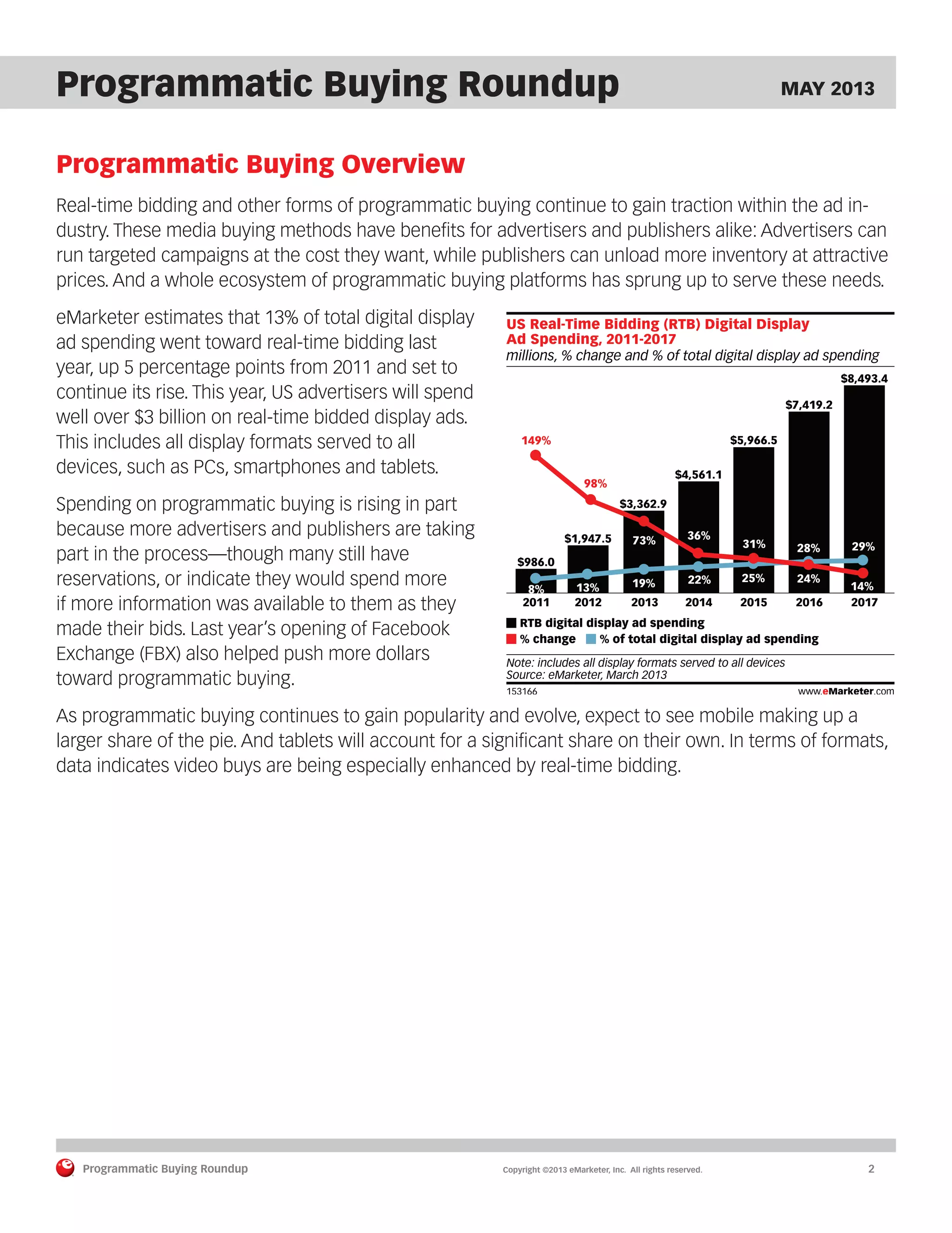 Programmatic buying methods like real-time bidding are attracting more advertising dollars as marketers and publishers recognize the benefits. Spending on programmatic buying is predicted to grow significantly in coming years, accounting for around one-third of all US digital display ad spending by 2017. The document provides an overview and statistics on key trends in programmatic buying, including growth in real-time bidding spending, mobile and video opportunities, and concerns from both publishers and marketers around issues like pricing, data and ad quality control.