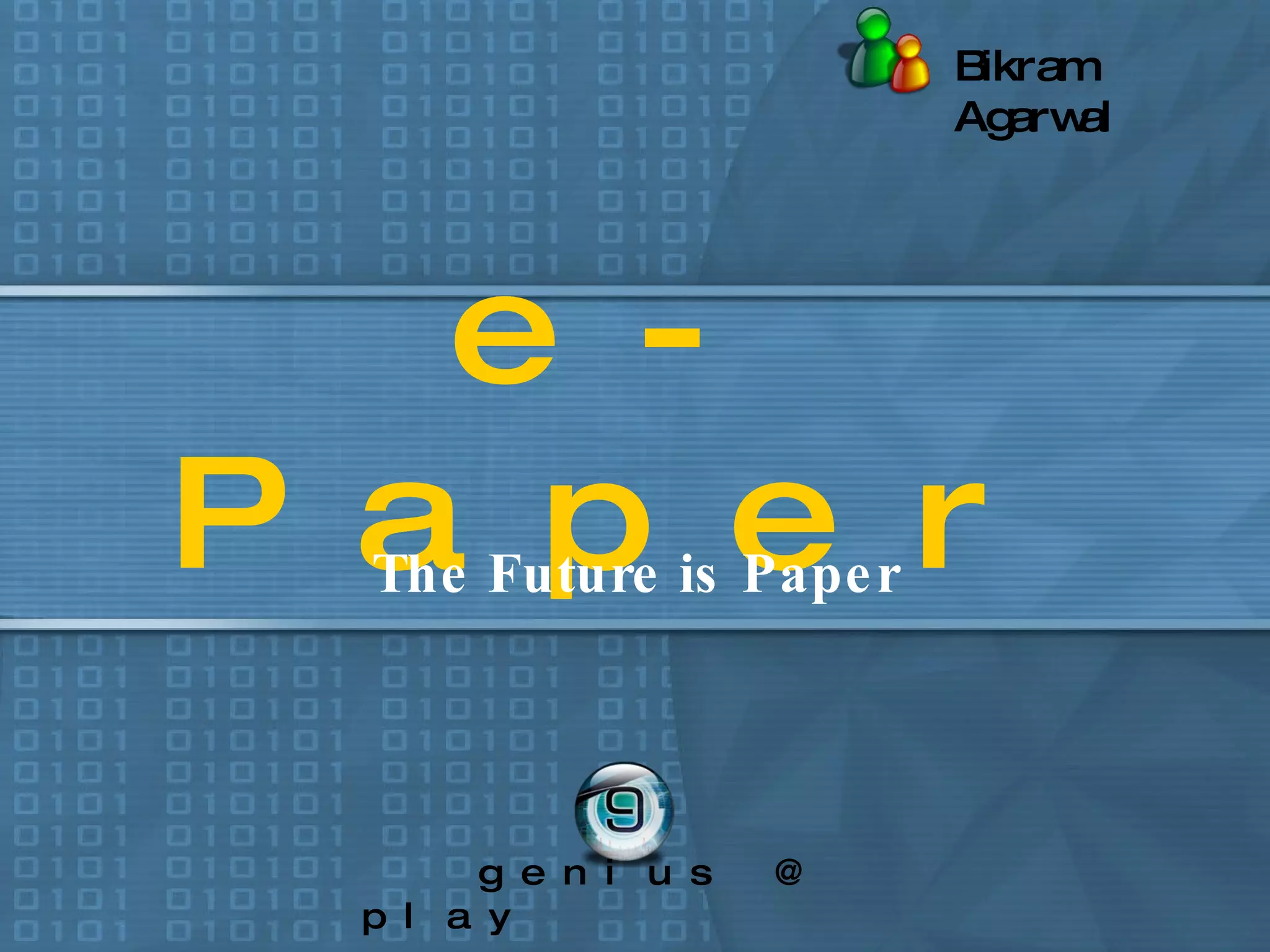 The document discusses the history and future of e-paper technology. It describes how e-paper works, current uses like e-book readers and smartwatches, and prototypes in development like foldable computer monitors and electronic newspapers. Some benefits of e-paper are its high contrast, low power consumption, and flexibility. Challenges include limited color and refresh rates. The document concludes that e-paper may replace backlit screens and bring paperback in a new electronic form.