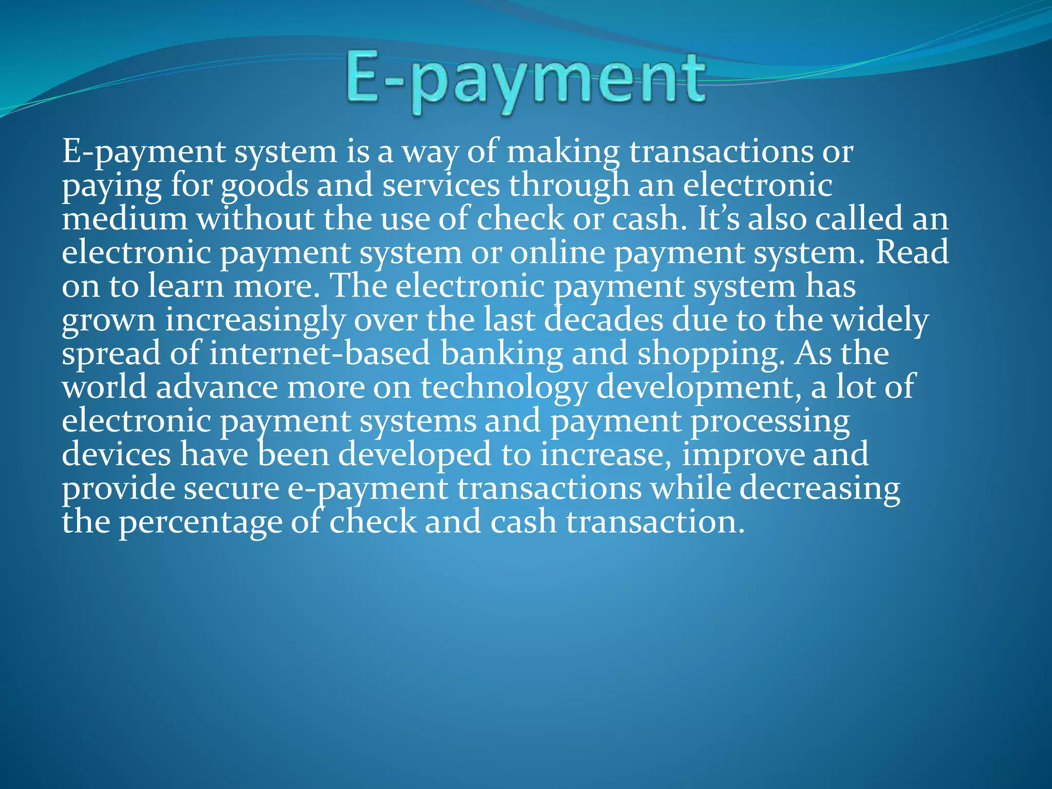 The document discusses electronic payment systems. It explains that electronic payment systems allow transactions to be made electronically without cash or checks by using online or mobile banking. The use of electronic payment methods has grown significantly with the rise of e-commerce and internet banking. Various electronic payment options are described, including digital wallets, credit/debit cards, e-checks, stored-value cards, and smart cards. The benefits of electronic payments for both consumers and merchants are convenience, security, and efficiency.