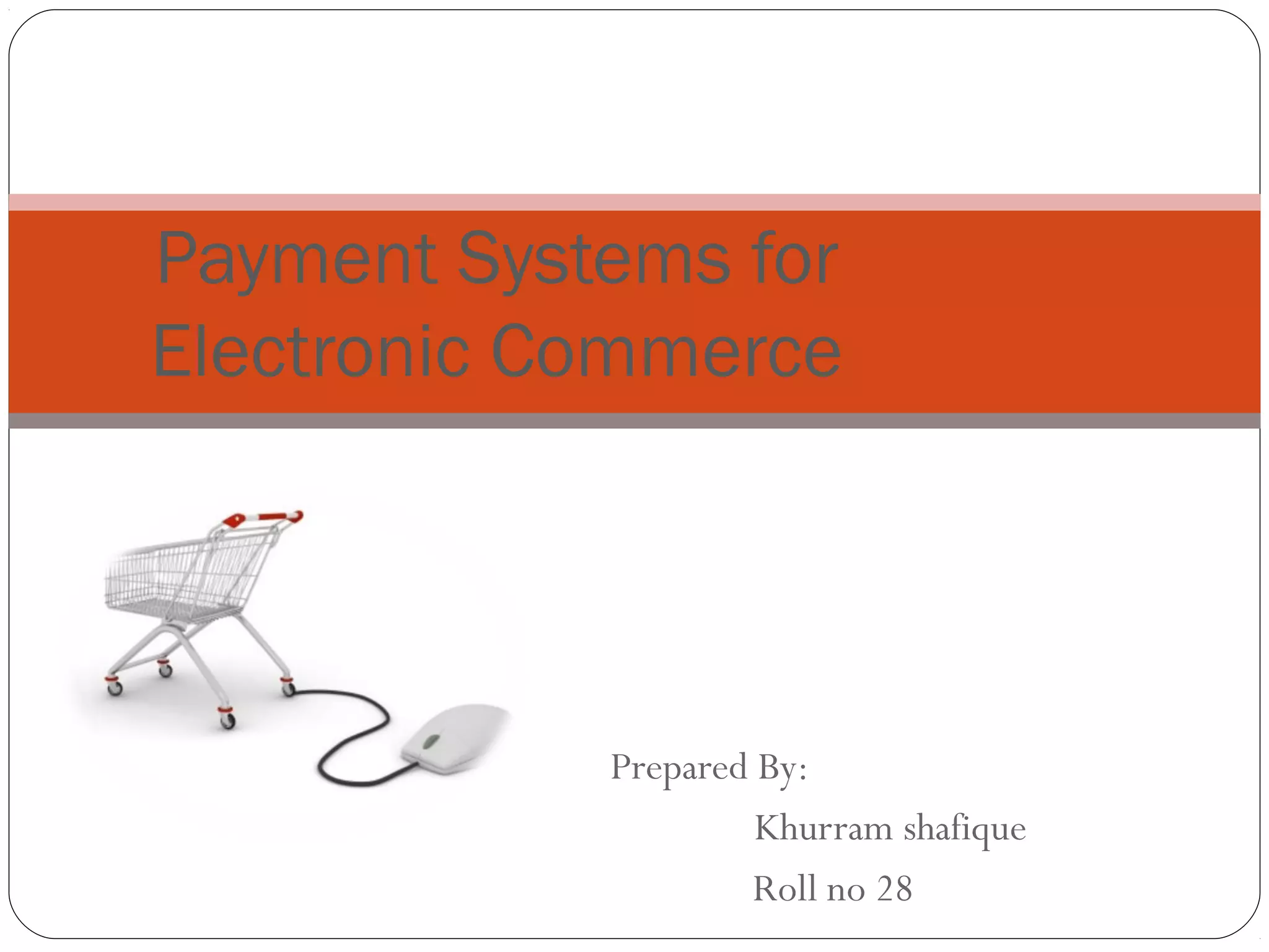 This document provides an overview of different electronic payment systems including payment cards, electronic cash, check free, check share, electronic wallets, and smart cards. It discusses the basic concepts and workings of these various e-payment methods. Key points covered include how payment cards like credit, debit, and charge cards work as well as their acceptance and processing. Advantages and disadvantages of payment cards and electronic cash are also summarized. The document also gives brief descriptions of different electronic wallet and smart card systems.