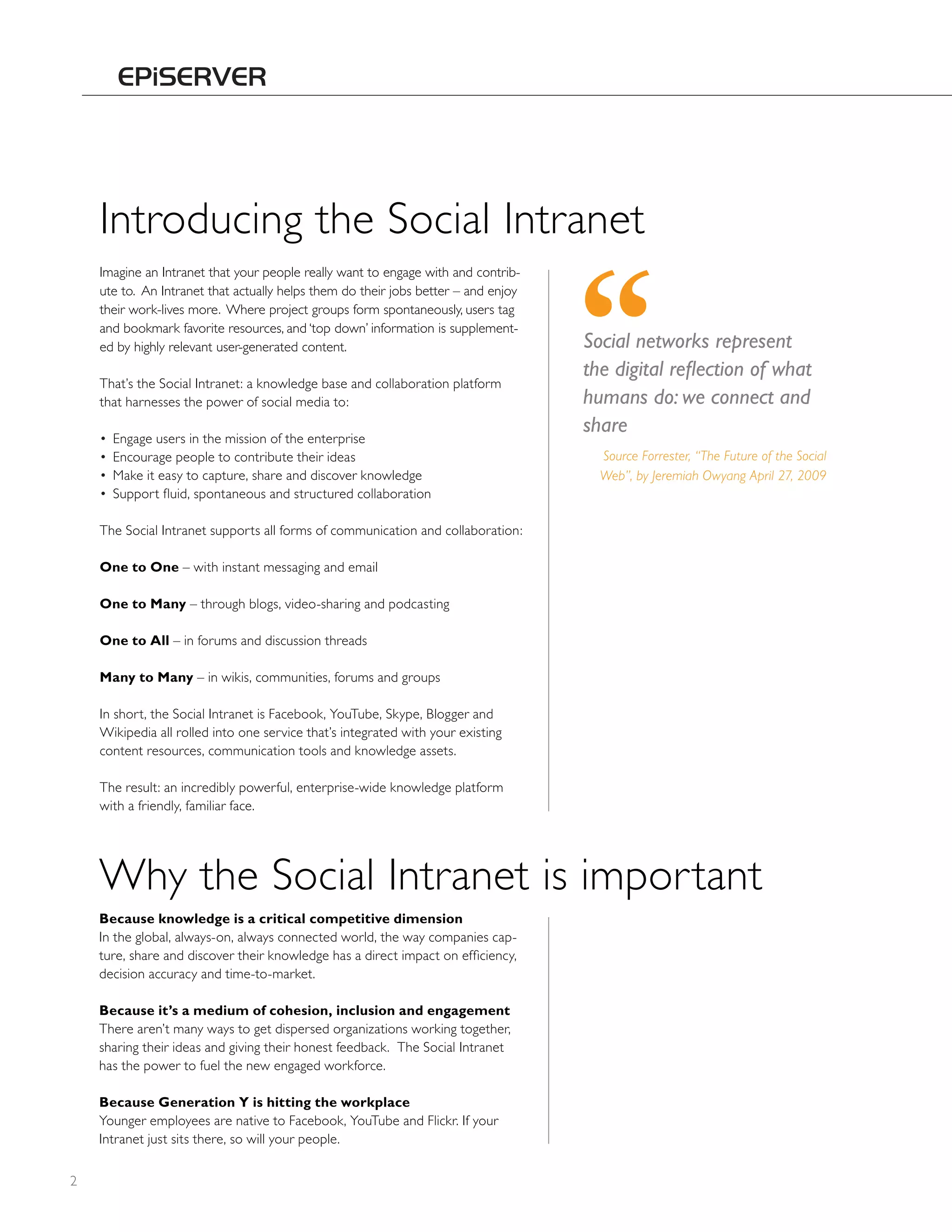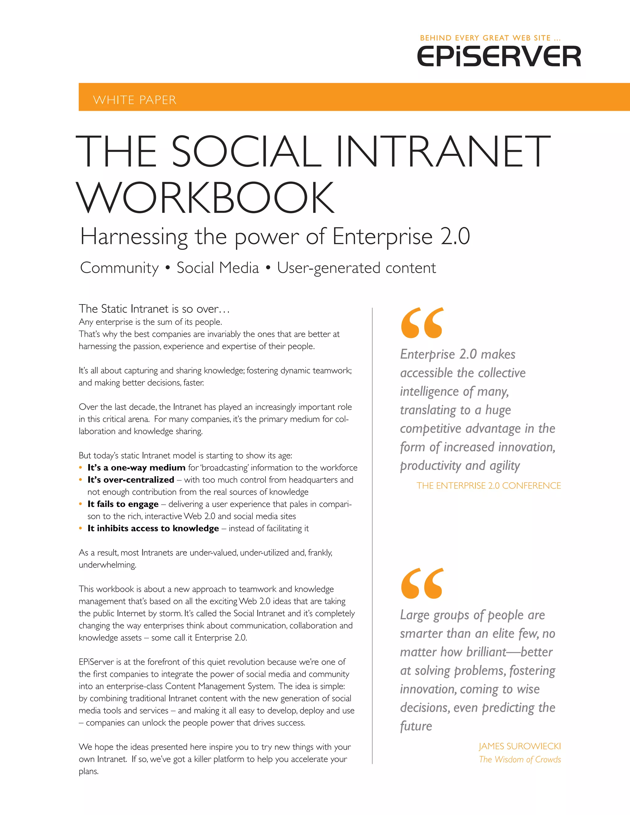 The document discusses the concept of the social intranet, emphasizing its importance in harnessing the collective intelligence of employees through user-generated content, social media integration, and enhanced collaboration tools. It critiques traditional static intranets for their limitations and presents the social intranet as a solution that fosters engagement, knowledge sharing, and improved productivity within organizations. The document outlines various features and benefits of the social intranet, including community forums, blogs, wikis, and easy integration with existing enterprise systems, ultimately aiming to transform workplace communication and teamwork.