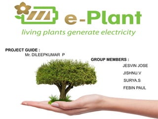 This document summarizes the project of designing an e-plant system to generate electricity from photosynthesis. It includes a block diagram, descriptions of the experimental setup and tests conducted on soil, electrodes, moisture levels, time of day, plant distance, and different plant types. The tests found electricity generation depends on these factors. The project group created artificial paddy fields and used the generated electricity to power a clock and lights. They conclude that with further research, plants and forests could become a power source for the world.