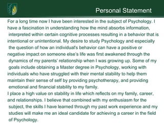 Luana Palermo is pursuing a Bachelor's degree in psychology from Argosy University with the goal of obtaining a master's degree and career in clinical psychology. She has a fascination with understanding cognitive processes and how individual behavior impacts others. Her interest in psychology was sparked by her parents' relationship during her childhood. Her goals are to provide psychotherapy to help individuals maintain their sense of self and to achieve emotional and financial stability for her family. She places high value on stability in life and believes her work experience, studies, and enthusiasm for psychology will help her succeed in this field.