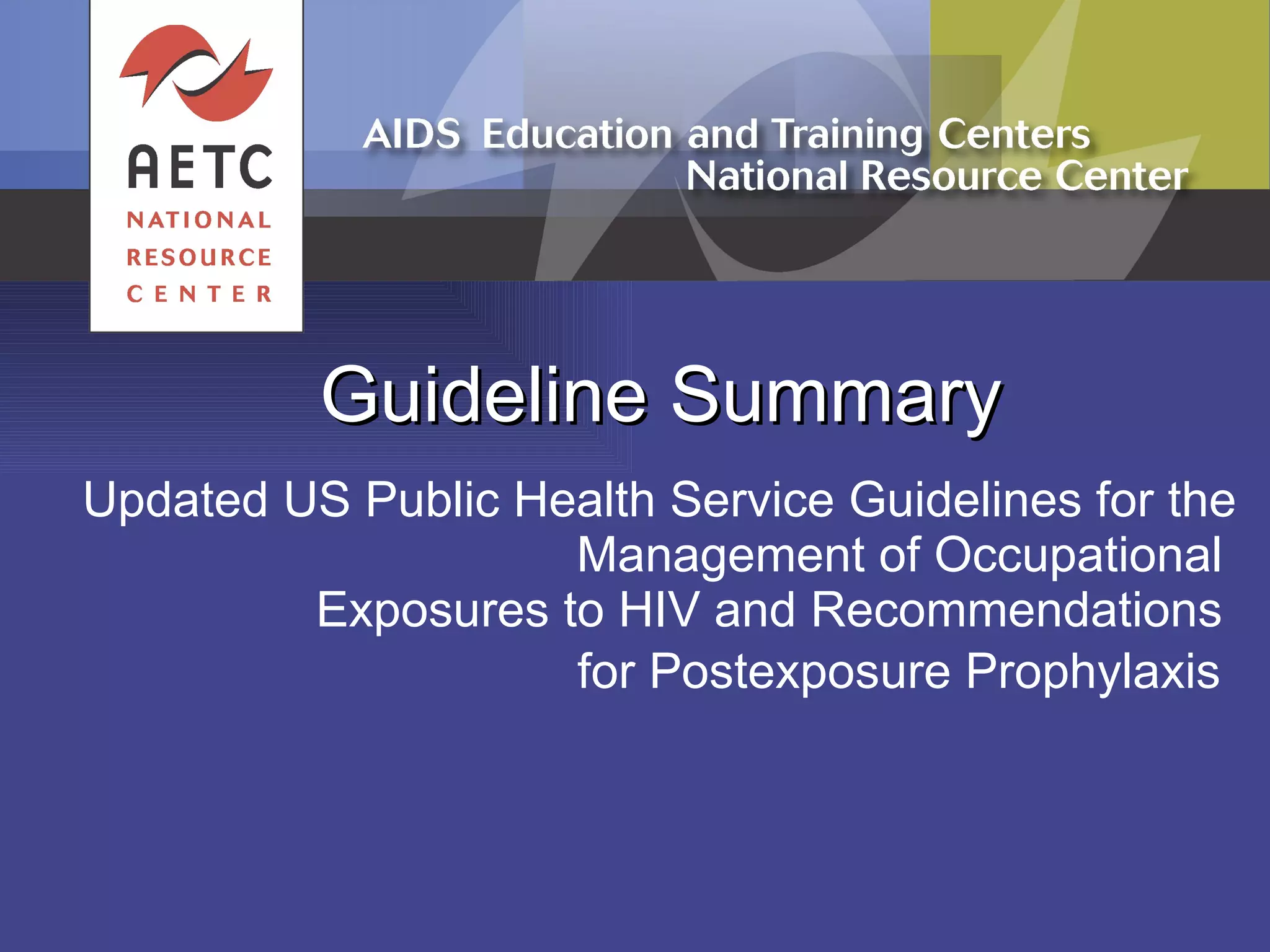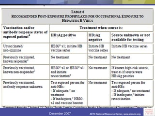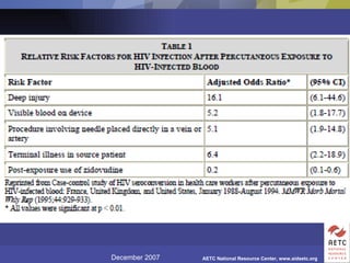 The document provides guidelines for managing occupational exposures to HIV, including recommendations for postexposure prophylaxis (PEP). It outlines when PEP is indicated, how to initiate it within 36 hours of exposure, and selecting an appropriate drug regimen for 4 weeks. It also discusses evaluating the exposed individual within 72 hours and considering source patient testing to help determine if PEP should continue or be discontinued.