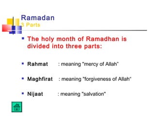 The document discusses the significance of the holy month of Ramadan in Islam. It is divided into three parts - Rahmat (mercy), Maghfirat (forgiveness), and Nijaat (salvation). Ramadan marks the beginning of revelations of the Quran to Prophet Muhammad and is a time for increased worship, spiritual reflection, strengthening family and community ties, and seeking forgiveness from Allah. Fasting during Ramadan helps develop self-discipline and gratitude.
