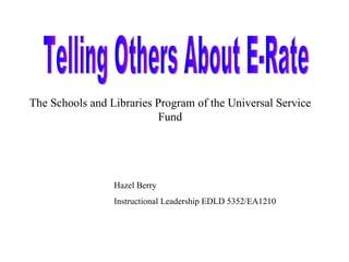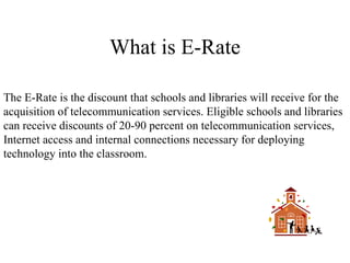This document summarizes key information about the E-Rate program, which provides discounts of 20-90% on telecommunication services, internet access, and internal connections for eligible schools and libraries. It outlines the services available like telephone lines, internet access, and basic network installation. Eligible entities include all public and private K-12 schools and public libraries. The level of discount is determined by the percentage of students eligible for free or reduced-price lunch programs. Applications are submitted to the Fund Administrator along with approved technology plans.