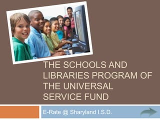 The document discusses E-Rate, a program that provides discounts for schools and libraries to obtain affordable telecommunications and internet access. It is administered by USAC under the FCC. Funding can be requested under four categories: telecommunications services, internet access, internal connections, and basic maintenance. The document also summarizes Sharyland ISD's technology plan, which aims to prepare students for technology needs now and in the future through achieving nine identified goals and maintaining upgraded infrastructure.