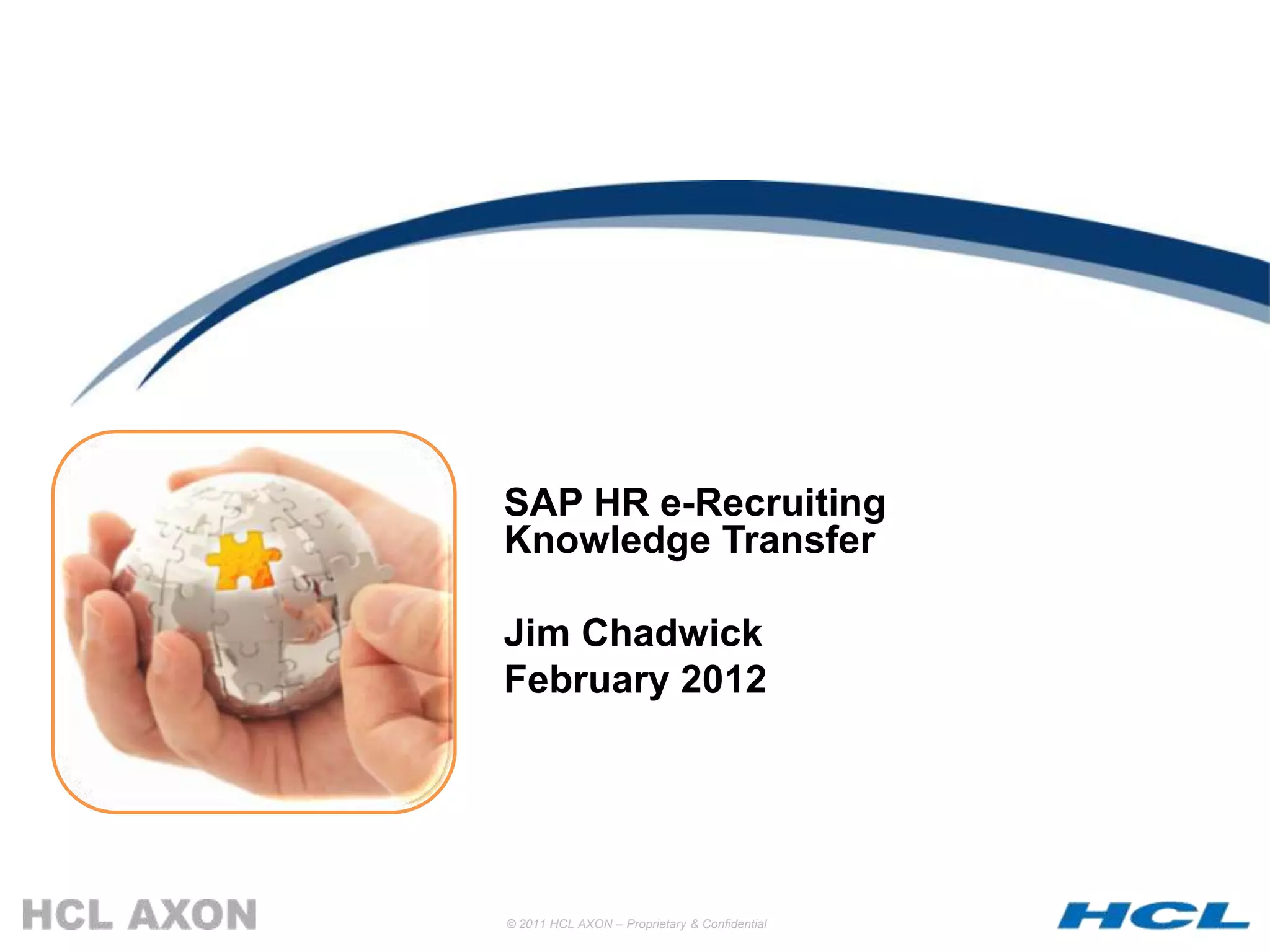 The document provides an overview of SAP's e-Recruiting application. It outlines the session which will cover the aim, application overview, technical considerations, solution overview including data model and terminology, configuration, user interfaces, and additional information sources. Key points include that e-Recruiting is a web-based talent management application, uses a talent warehouse concept, and can integrate with other SAP solutions. It supports all recruitment processes and uses standard SAP objects and relationships.