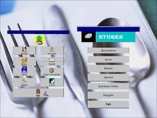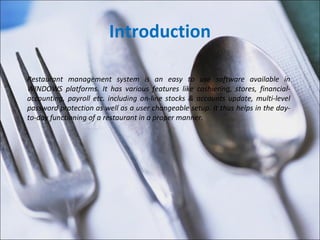 eRestro is restaurant management software that allows users to manage various functions like cashiering, inventory, accounting, and payroll. It has features like online updating of stocks and accounts, multi-level password protection, and a customizable setup. The software allows cashiers to enter customer orders and bills, manage tables and reservations, track sales and inventory. It also helps accountants manage vouchers, cash books, purchase bills, and sales. Additionally, the payroll module tracks employee attendance and work information.