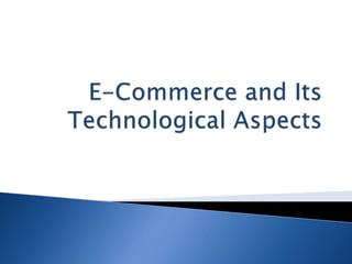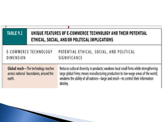 The document explains the concept of commerce and electronic commerce (e-commerce), emphasizing its role in the exchange of goods and services through digital platforms. It highlights the benefits of e-commerce for businesses and consumers, such as improved efficiency, market access, and customer convenience, while also addressing challenges like security, infrastructure, and legal issues. Furthermore, it discusses various dimensions of e-commerce technology, such as ubiquity, global reach, and personalization, which enhance the overall business landscape.