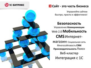 Документ описывает преимущества платформы «1С-Битрикс» для создания и управления интернет-магазинами, предлагая интеграцию с 1С, высокую безопасность и возможность быстрой настройки. Платформа обеспечивает легкое управление контентом, удобный интерфейс, многосайтовость и мощные функции для работы с заказами и аналитикой. Также отмечаются возможности мобильной торговли и облачного хранения данных, акцентируя важность надежности и производительности интернет-магазина.