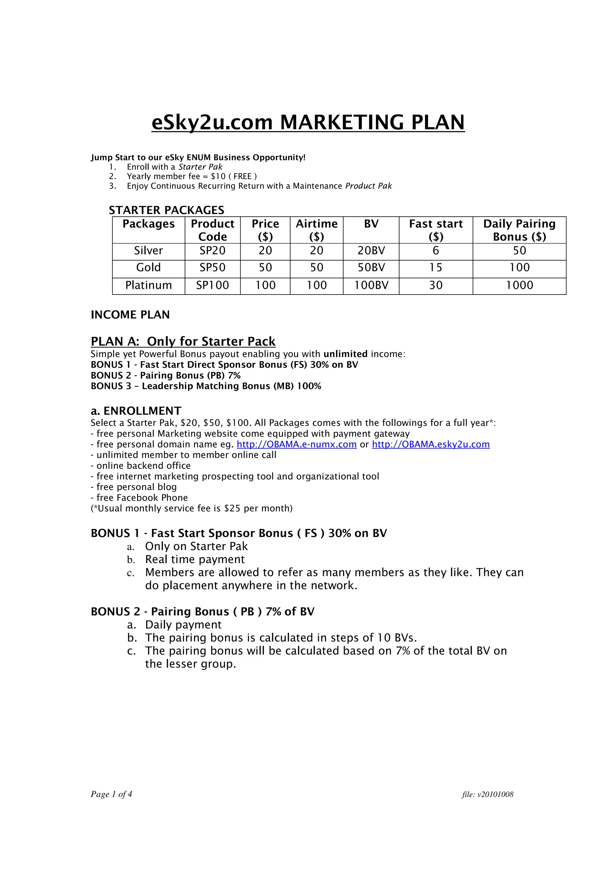 This document outlines the marketing plan and income opportunities for eSky2u.com. There are starter packages priced from $20-100 that provide various benefits and bonuses. The income plan includes fast start bonuses, daily pairing bonuses, and leadership matching bonuses calculated based on package purchases and referrals. The plan also details maintenance product packages, qualification criteria for different bonus levels, and stockist franchise programs for mobile and city top up centers.