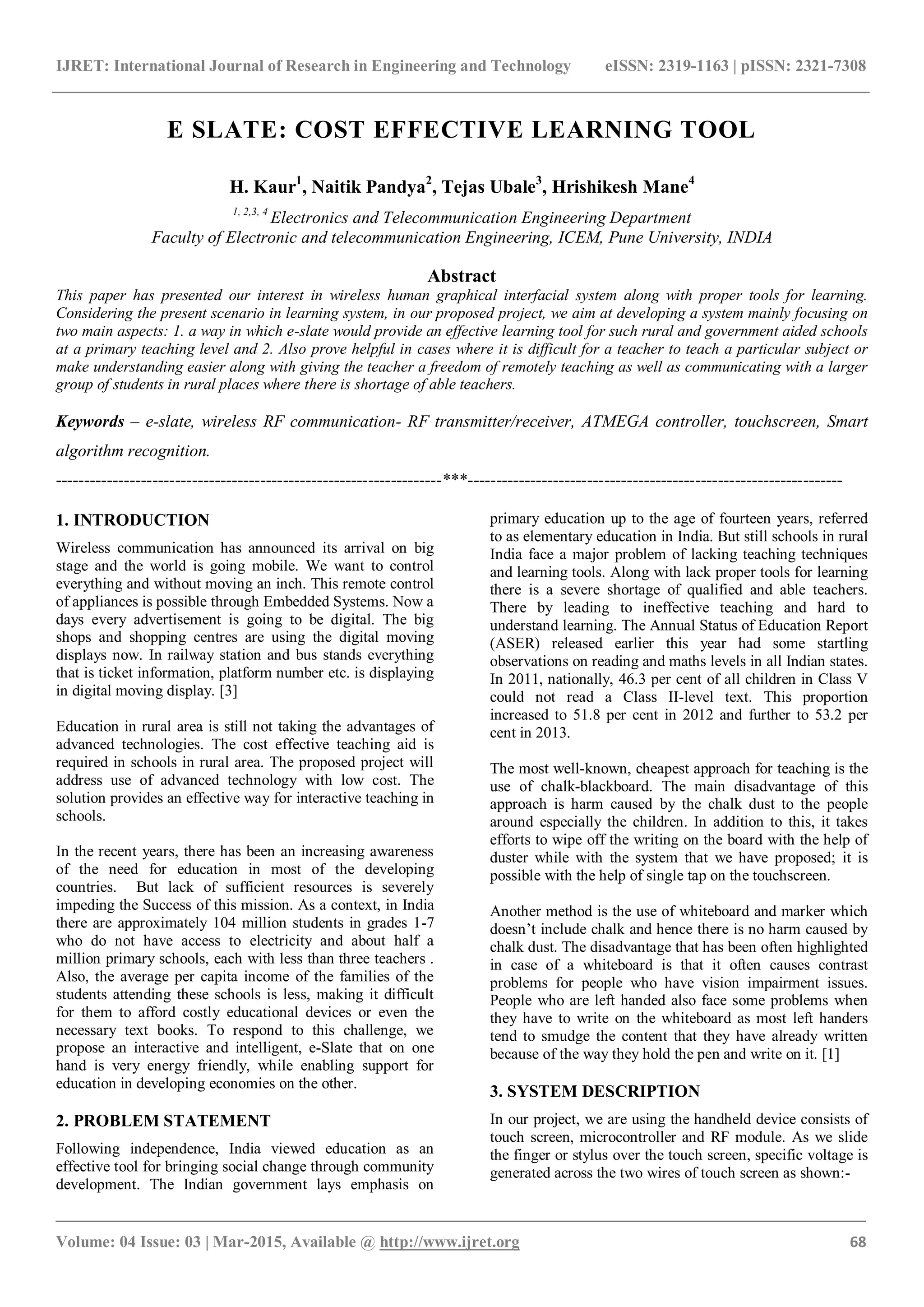 The document presents a proposal for an interactive e-slate learning tool aimed at enhancing education in rural and underserved schools in India. It addresses the lack of effective teaching techniques and resources, offering a cost-efficient solution utilizing wireless communication and touch technology to facilitate remote teaching. The system allows for easier understanding and interaction in classrooms, ultimately aiming to improve educational outcomes for students in areas with limited access to qualified teachers.
